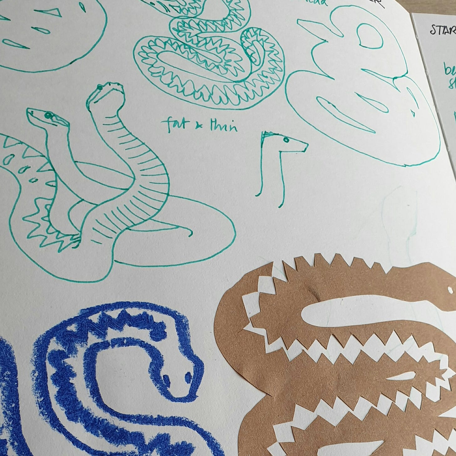 The green cut-out shapes have been great to play, inspire new shapes and prevent me from trying to draw something too realistic.