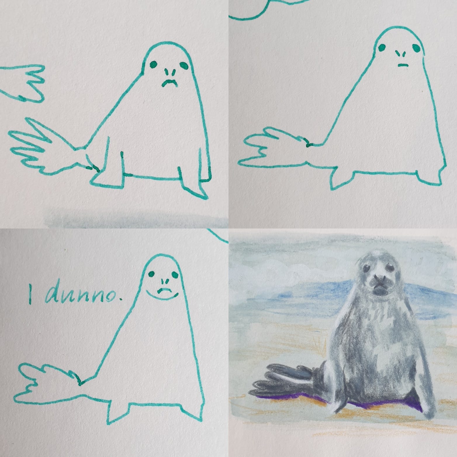 A special mention for day 5 which turned out to be the tricky one. Who knew a Grey Seal was such a slippery customer, a grumpy slug blob with flippers. The initial outline sketches were hard, they need tone to bring them to life. So grateful for the sad looking weirdos though, they make me laugh every time I see them.